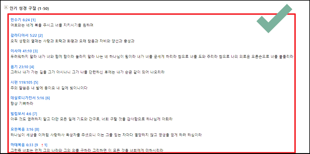 ▲ 위와 같이 많은 사람들이 선호하는 성경구절을 쉽게 살펴볼 수 있어요.