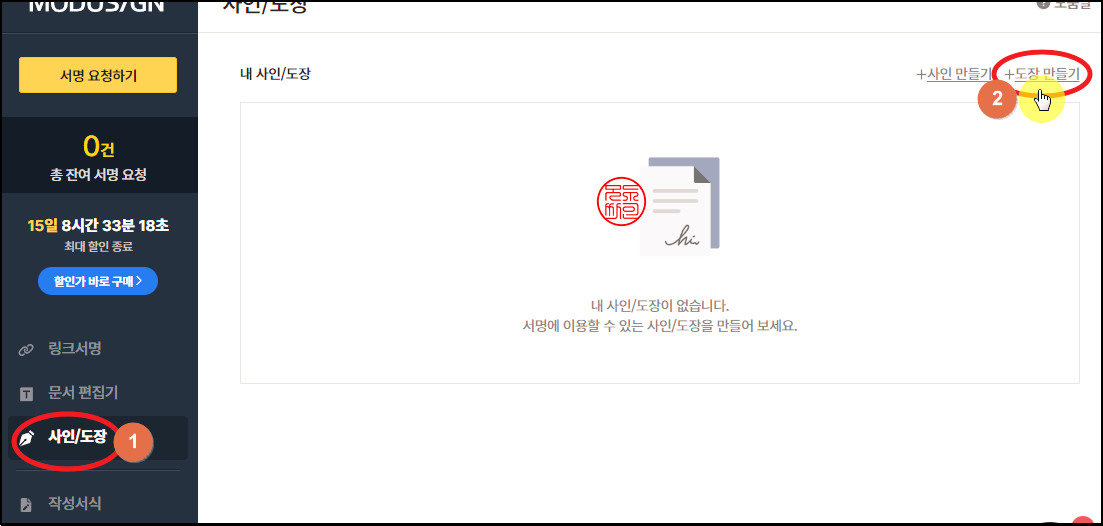 로그인을 하게 되면 다음과 같은 도장 및 사인 만들기 페이지가 열립니다. 여기에서 [도장 만들기] 버튼을 클릭해 주세요.