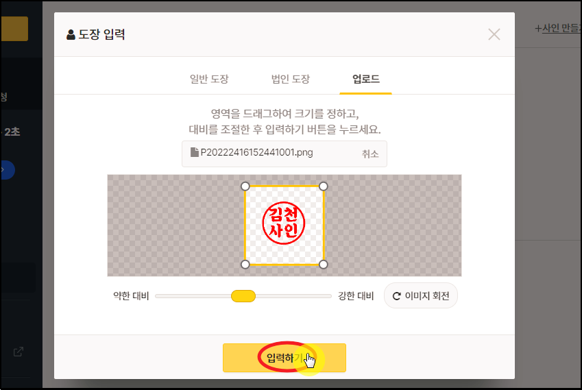 업로드 메뉴를 선택하면 [파일 업로드] 버튼이 있는데요. 해당 버튼을 눌러서 도장을 스캔하여 얻은 파일을 업로드 합니다. 업로드가 완료되면 다음과 같이 화면에 해당 이미지가 나타나는데요. 여기에서 대비를 조절할 수 있는데요. 자동으로 배경이 투명이 되도록 적절하게 대비가 조절이 되어 있습니다. 이 상태에서 [입력하기] 버튼을 눌러주세요.