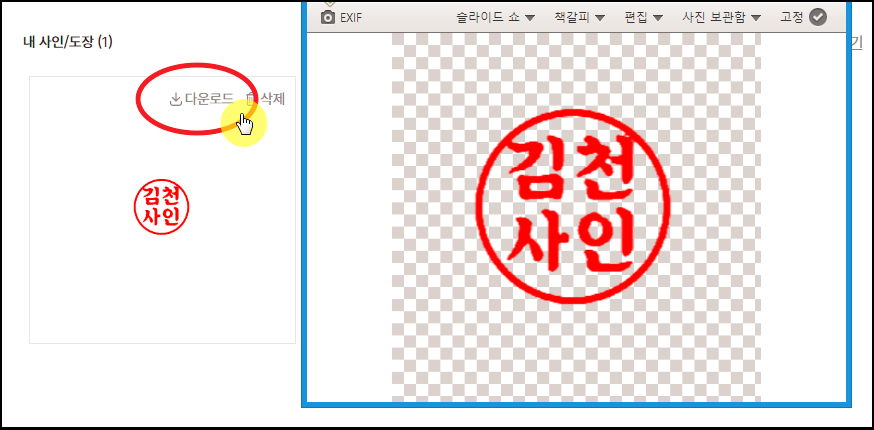 마지막으로 [내 사인 / 도장] 목록에 보면 우리가 작업한 결과물이 있을 겁니다. 여기에서 [다운로드] 버튼을 누르면 배경이 투명인 도장 이미지 파일을 얻을 수 있어요.