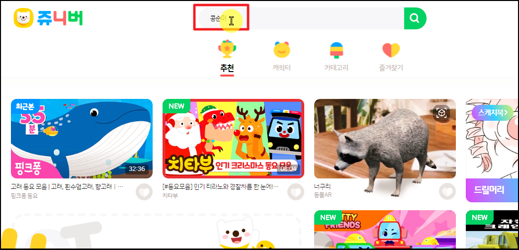 ▲ 쥬니버 사이트에 접속했습니다. 여기서 콩순이 율동동영상을 찾아보도록 하겠습니다.