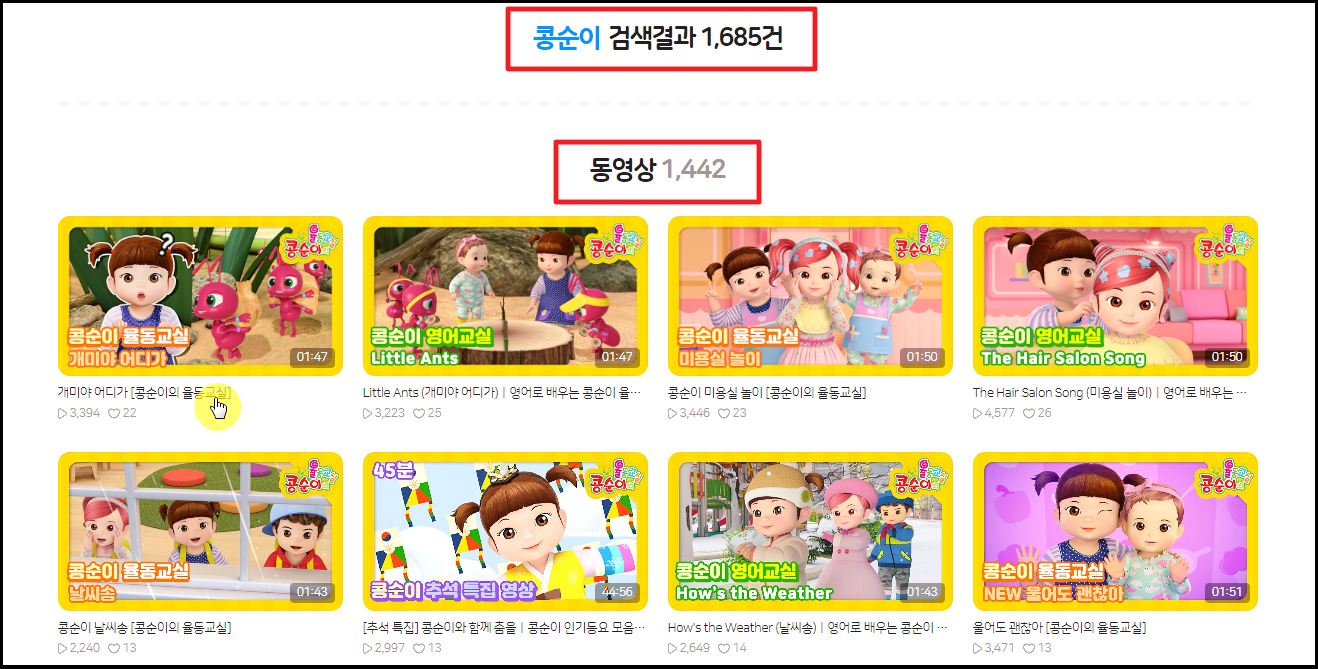 ▲ 콩순이에 관련된 동영상 자료가 1,442개나 나왔습니다. 모두 율동에 관련된 것은 아니고, 율동동영상 더 있지만, 노래를 부르거나 우리 콘텐츠 등이 포함되어 있습니다.