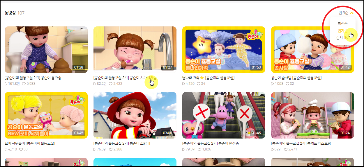 이런 경우에는 정렬 기능을 사용해 보세요. 인기 순서로 정렬하거나 최근에 업데이트 되는 순서대로 정렬하는 것이 가능합니다. 율동 교실 시리즈가 있는데요.