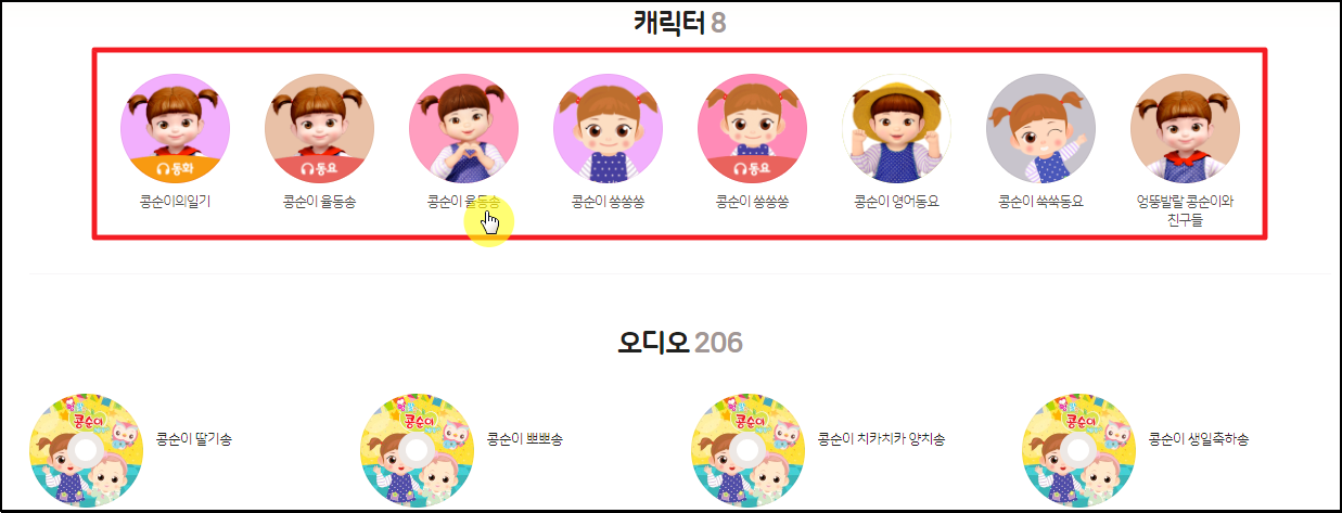 ▲ 캐릭터 부분을 보면 콩순이 관련 컨텐츠가 어떤 종류가 있는지 알 수 있습니다.