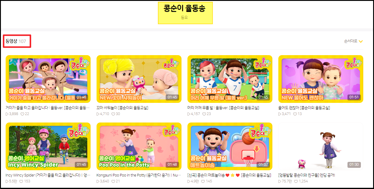 ▲ 제가 이용하는 서비스의 경우에는 콩순이 율동동영상을 107개나 제공하고 있습니다.