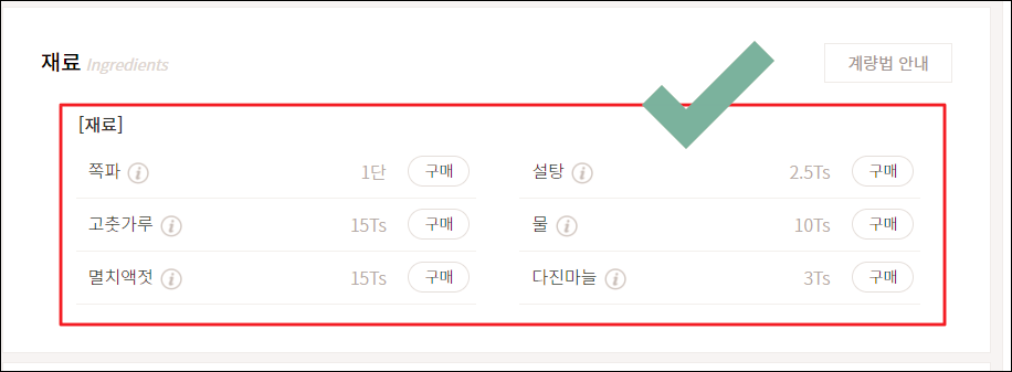 ▲ 다음은 재료 부분입니다. 쪽파, 설탕, 물, 다진마늘, 고춧가루, 멸치액젓이 들어간다고 하네요.