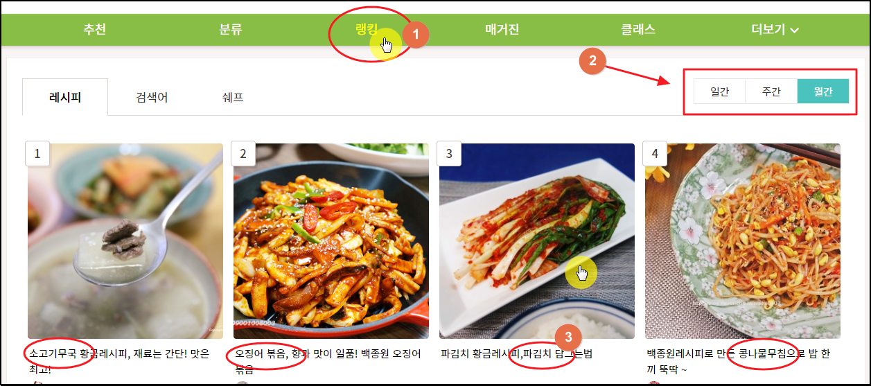 50가지 이상의 반찬 종류를 알아보고 싶다면 메뉴에서 [랭킹]을 선택해 보세요. 그럼 일간, 주간, 월간별로 구분하여 인기 있는 반찬 순위를 확인할 수 있습니다. 여러 가지 맛있는 요리가 나타났는데요.