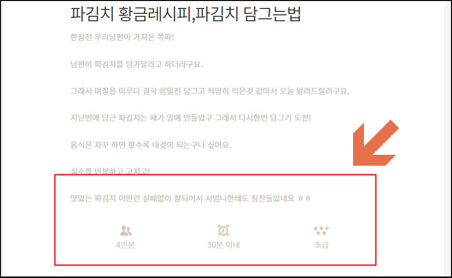 가장 먼저 간단한 소개와 요리 시간, 난이도 확인을 할 수 있는데요. 여기 나와 있는 인분은 여기서 알려주는 재료를 사용했을 때 얼마의 양의 반찬을 만들 수 있는지 알 수 있는 부분입니다.