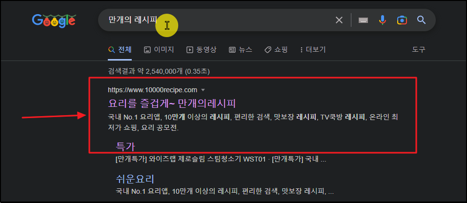 ▲ 만개의 레시피 사이트에 접속했습니다.
