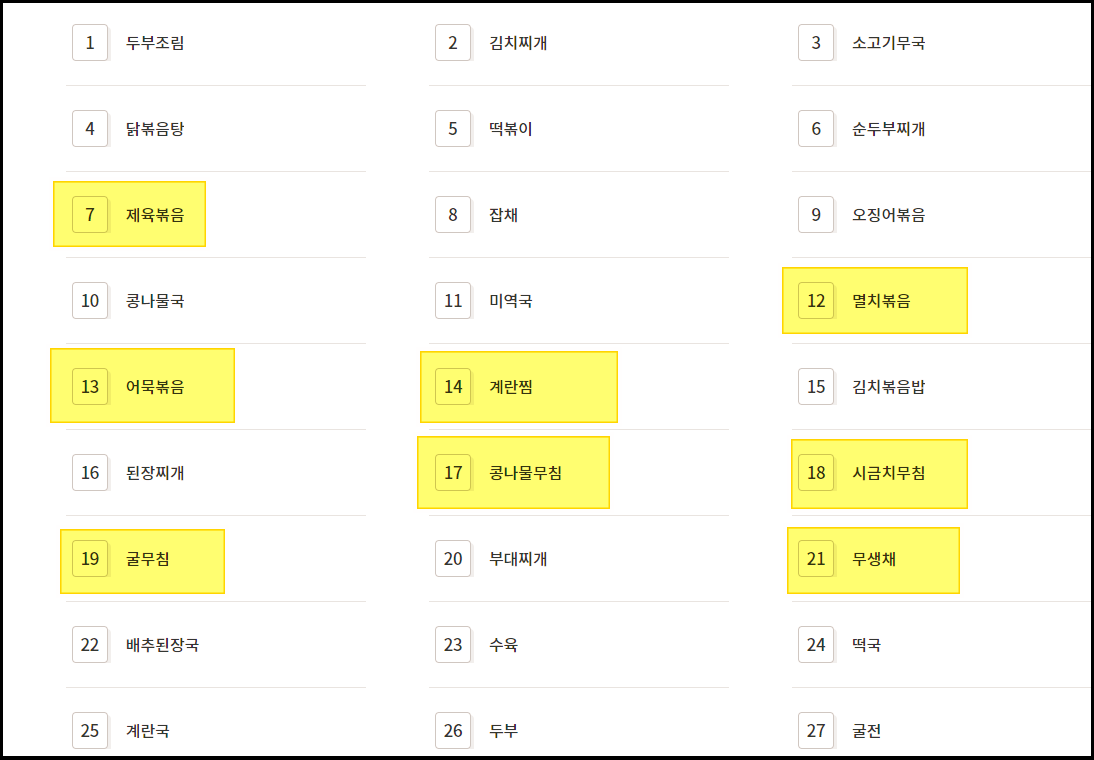두부조림, 김치찌개, 소고기무국, 닭볶음탕, 떡볶이, 순두부찌개, 제육볶음, 잡채, 오징어볶음, 콩나물국, 미역국, 멸치볶음, 어묵볶음, 계란찜, 김치볶음밥, 된장찌개, 콩나물무침, 시금치무침, 굴무침, 부대찌개, 무생채, 배추된장국, 수육, 떡국, 계란국, 두부, 굴전