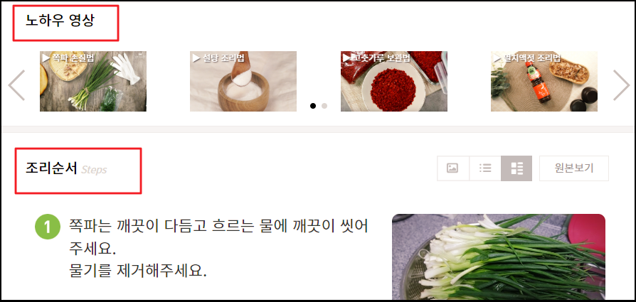 ▲ 우리가 선택한 반찬을 만들 때 어떤 순서로 만들면 되는지 상세한 조리순서와 노하우 영상을 확인할 수 있습니다.