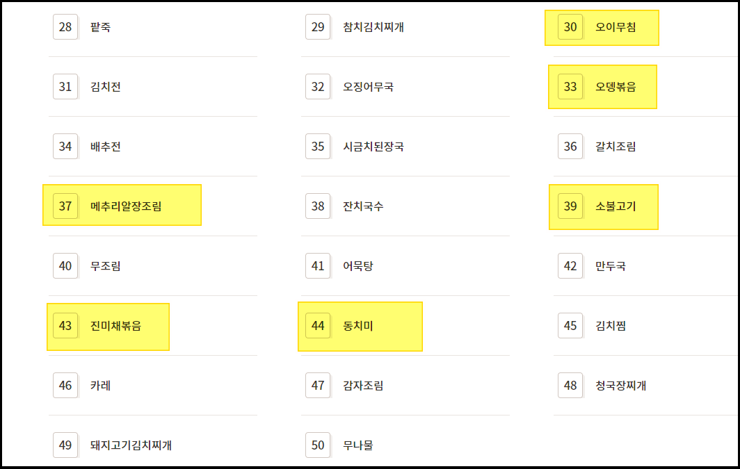 반찬종류 50가지를 순서대로 나열해보겠습니다.