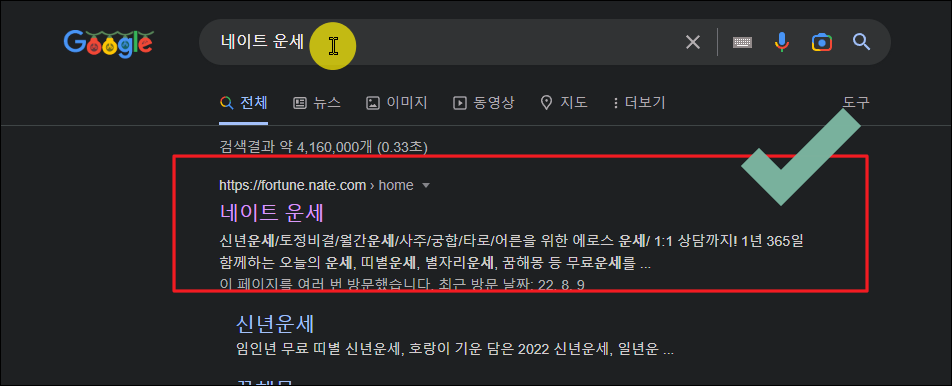 방금 풀이 결과를 살펴본 것은 네이트 운세 사이트에서 이용이 가능합니다. 무료로 이용할 수 있는 서비스이기 때문에 부담이 전혀 없어요.