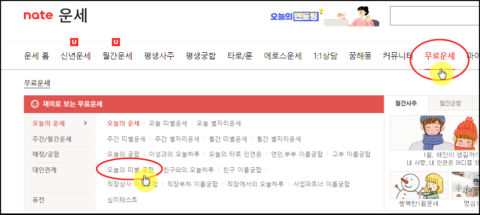 여기에서 "오늘의 띠별 궁합"을 선택해 주세요. 이를 통해 나와 잘맞는띠를 찾을 수 있어요. 참고로 띠별운세에 관심이 있는 분들은 이곳에서 일간, 주간, 월간으로 볼 수 있는 띠별운세 서비스도 무료로 제공하고 있으니 나중에 필요할 때 이용해 보시길 바랍니다.