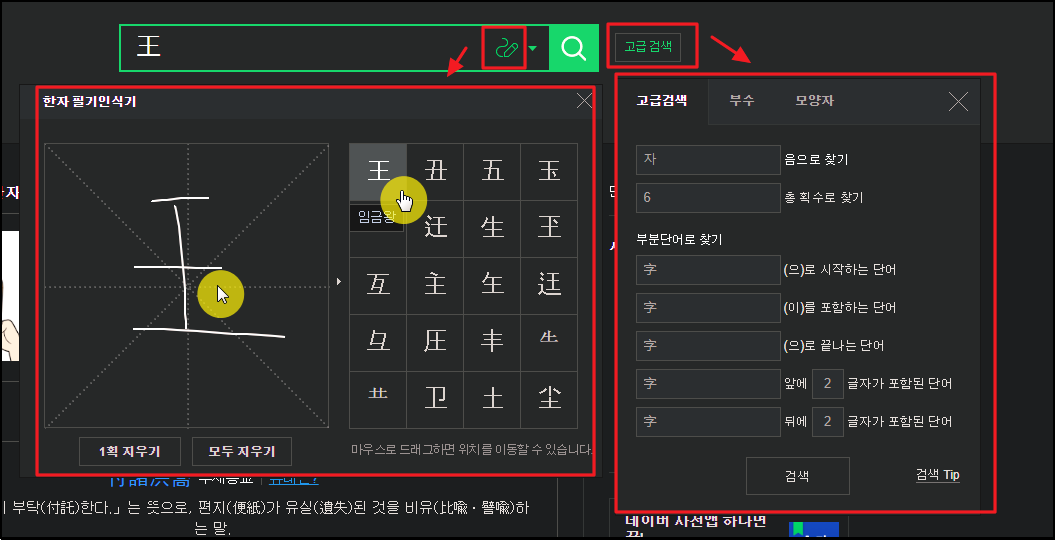 해당 버튼을 누르면 기존의 옥편 한자찾기 방식을 모두 사용할 수 있습니다. 부수, 모양자, 음, 총획수는 기본이고, 부분단어로 한자찾기 가능하죠.