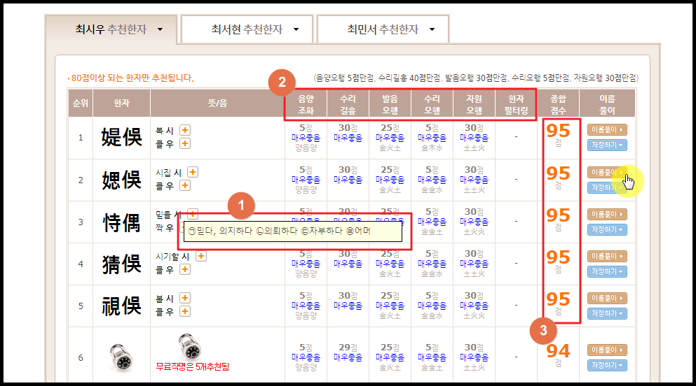 여기에서는 한자의 뜻과 함께 성명학 이론에 맞는 음양조화, 발음오행, 수리오행, 자원오행, 수리길흉 이렇게 5가지를 가지고 점수를 매기는데요.