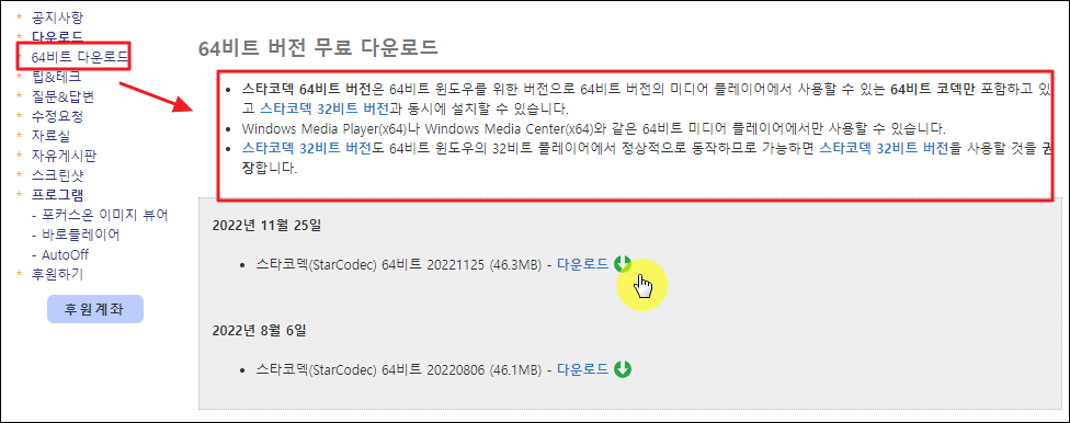 사이트에 접속하면 좌측에 있는 메뉴에서 다운로드를 클릭해 보세요. 그럼 해당 통합코덱 프로그램을 무료로 다운로드 받을 수 있도록 되어 있는데요. 요즘에는 윈도우 운영 체제를 대부분 64비트를 사용합니다. 이를 참고하여 64비트 윈도우에서 사용가능한 프로그램을 다운로드 받아 주세요.