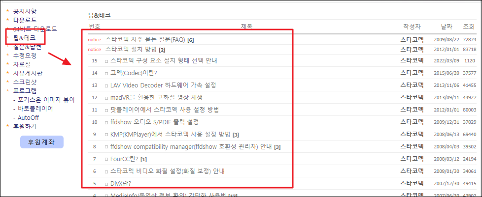 통합코덱을 사용하다가 궁금한 점이 있거나 제대로 작동이 되지 않는 일이 발생할 수 있는데요. 이럴 때에는 좌측에 있는 메뉴에서 팁&테크를 선택해 보세요. 스타코덱 구성요소 설치형태 선택 안내, 팟플레이어에서 스타코덱 사용 설정 방법, 통합코덱 비디오화질 설정 안내 등의 유용한 매뉴얼을 찾아볼 수 있습니다. KM 플레이어에서도 통합코덱을 사용할 때 어떻게 설정하는지 방법을 알려 주고 있네요.