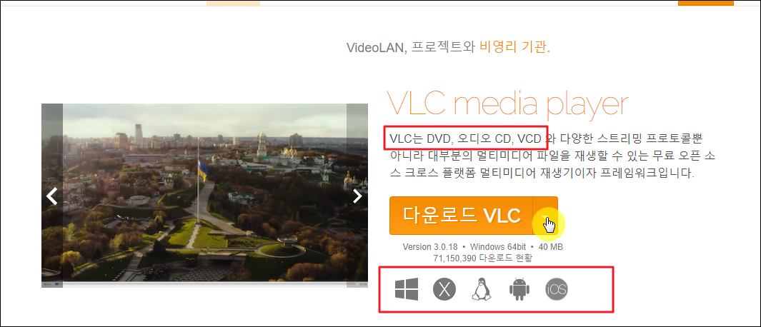 공식 홈페이지에 접속했습니다. 바로 다운로드 버튼이 나타나 있는데요. 이 버튼을 눌러서 프로그램을 다운로드 받아 설치해 주세요. 앞서 언급한 바와 같이 윈도우, iOS, 맥북, 안드로이드, 리눅스와 같이 어떤 운영체제에서는 사용이 가능합니다. 그리고 동영상뿐만 아니라 오디오도 재생이 가능합니다. 그렇기 때문에 음악을 들을 때 이용하시는 것도 좋습니다.