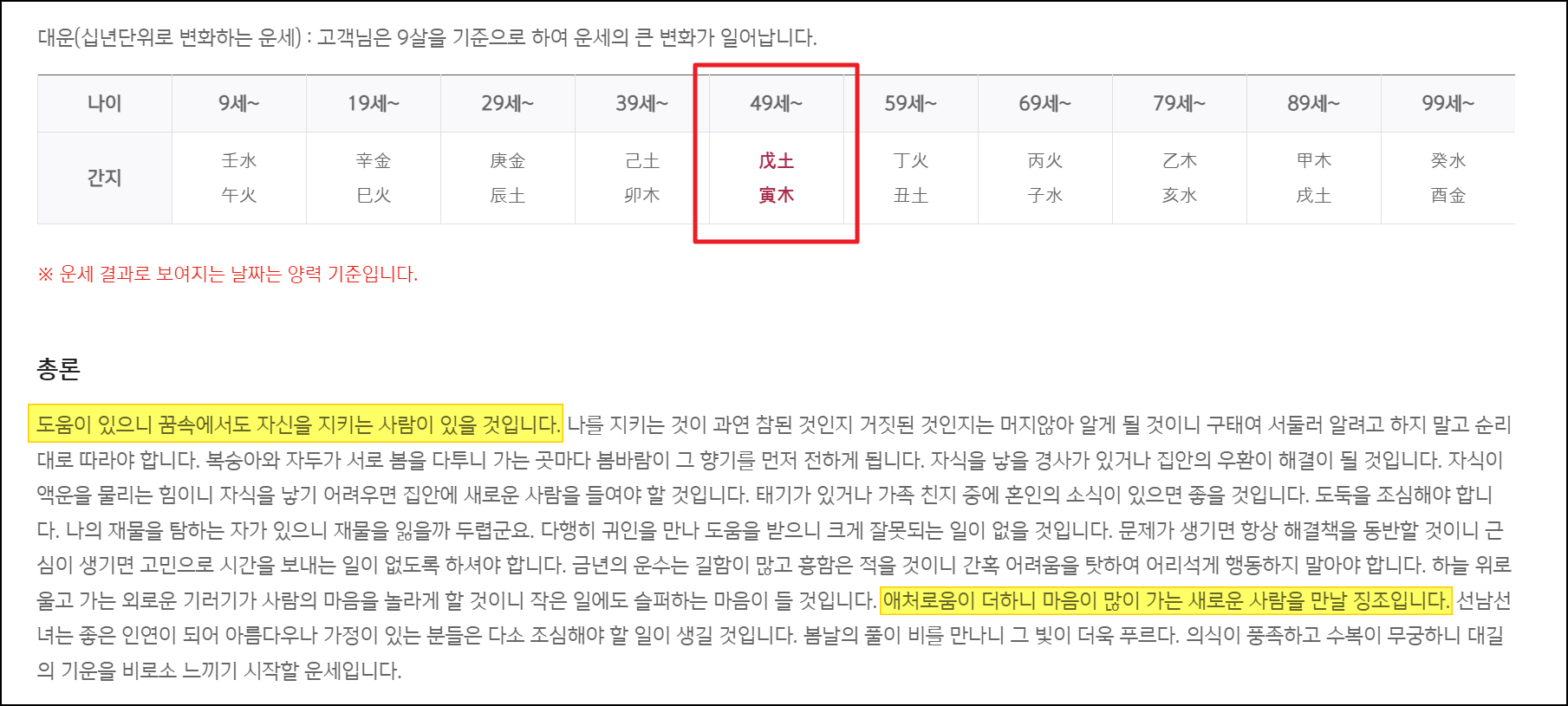 풀이 내용에서 가장 먼저 나오는 것은 사주명식표와 이에 포함되는 대운이에요. 대운은 10년에 한 번씩 큰 변화를 가져오는 운세라고 할 수 있는데요. 어느 나이가 대운에 해당하는지 확인할 수 있어요. 그 다음은 23년 한해에 어떠한 일이 일어나는지 전체적인 분위기를 살펴볼 수 있는 총론 입니다.