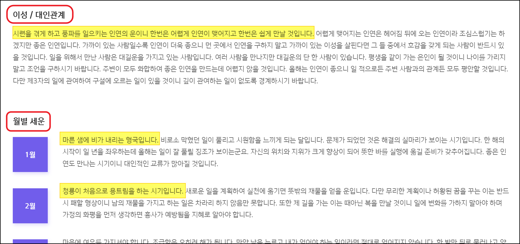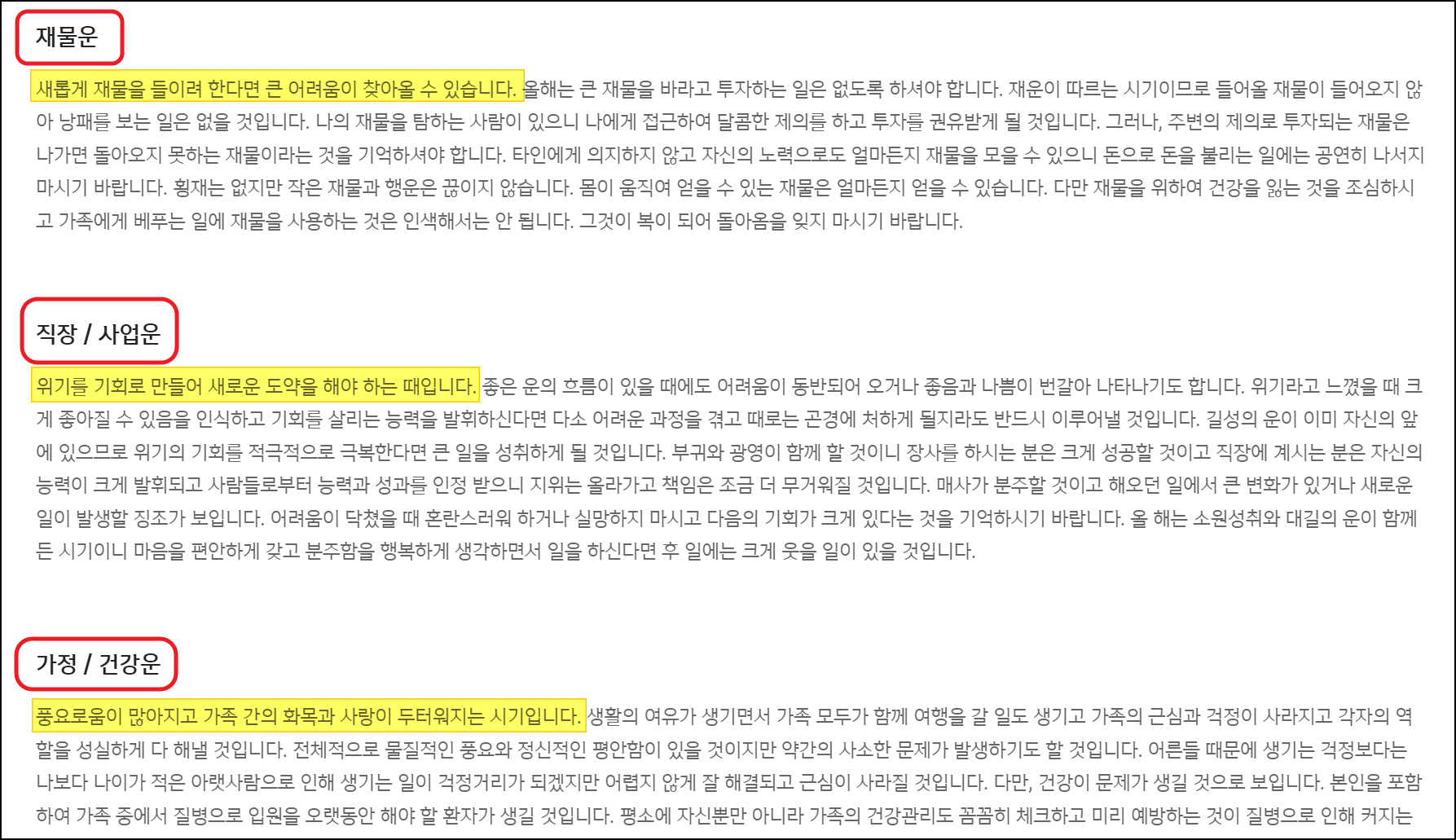 총론 다음에는 재물운, 직장 및 사업운, 가정 및 건강운을 알아볼 수 있는데요. 경제에 관련된 것은 재물운을 살펴보면 되고, 사업장을 가지고 있거나 직장에서 두각을 나타내고 싶은 분이라면 직장 및 사업운을 꼭 참고하시는 것이 좋아요. 가장 중요한 가정과 건강에 대한 것은 필수이고요.