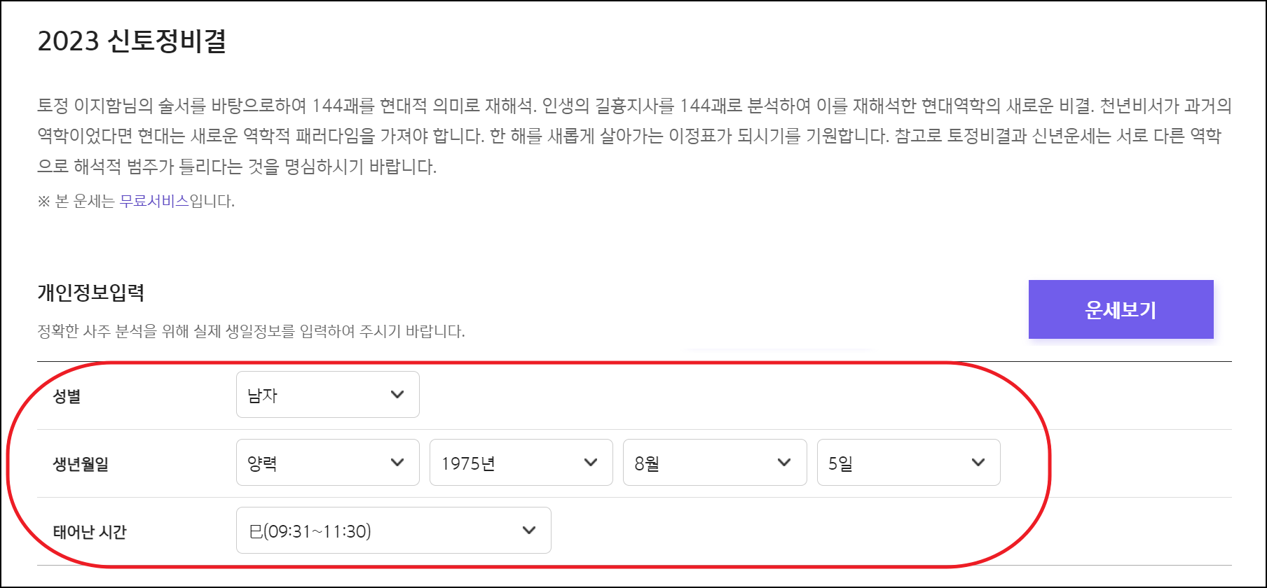 토정비결 서비스 이용을 위해서는 몇 가지 정보 입력을 해야 하는데요. 점집에서 자주 물어보는 태어난 연도와 월, 일, 시간 정도 입력하면 됩니다. 성별도 나의 운세에 큰 영향을 주는 요소 중 하나이기 때문에 정확하게 입력해야 하고요. 다 입력했으면 "운세보기" 버튼을 클릭해 주세요.