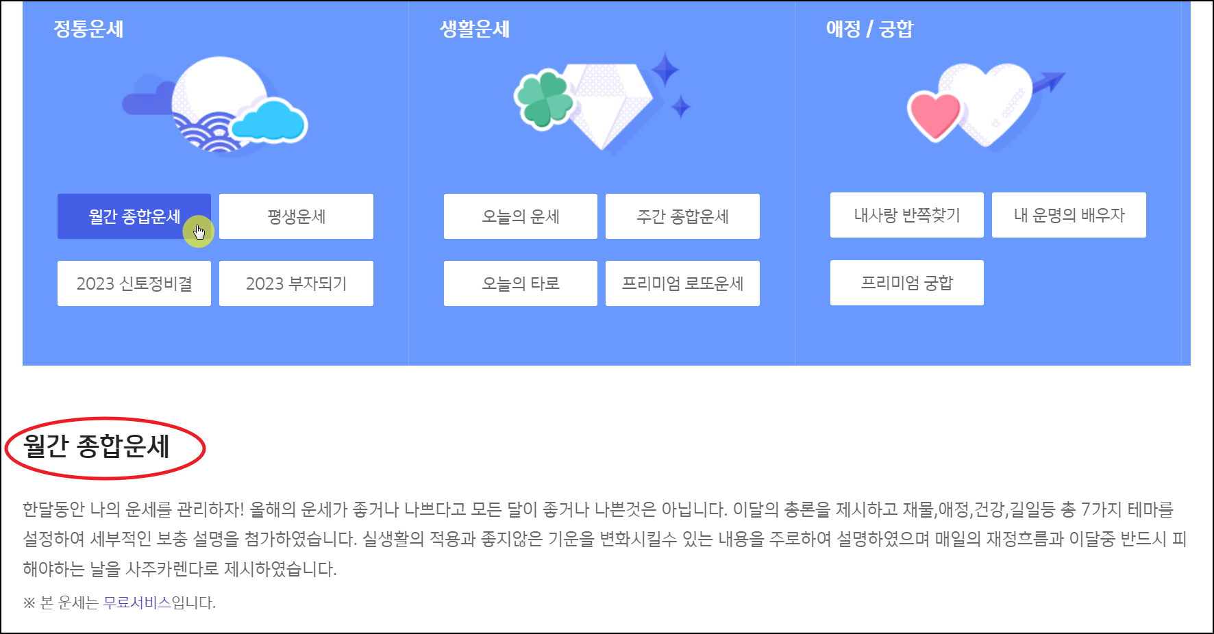 새롭게 페이지가 열리면 무료 이용이 가능한 정통운세 시리즈가 나타나는데요. 이 중에서 세 번째가 23년 토정비결 서비스입니다 새해를 맞이하여 계획을 세우거나 길흉지사를 알아보고 싶을 때 이용하면 정말 좋아요.