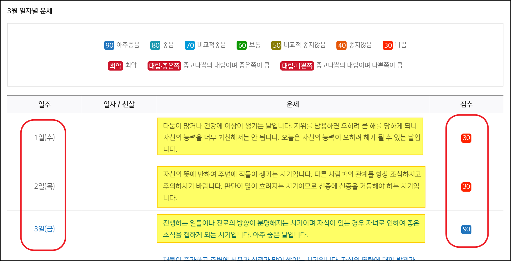기본적으로 토정비결에서는 한 해에 대한 총론, 개별운, 월별세운 이렇게 3가지 구성으로 나뉩니다. 다음과 같이 일자별 운세는 제가 이용하는 무료 운세 사이트에서 추가적으로 제공하는 부분인데요. 23년 토정비결을 보면서 함께 이용이 가능해요.