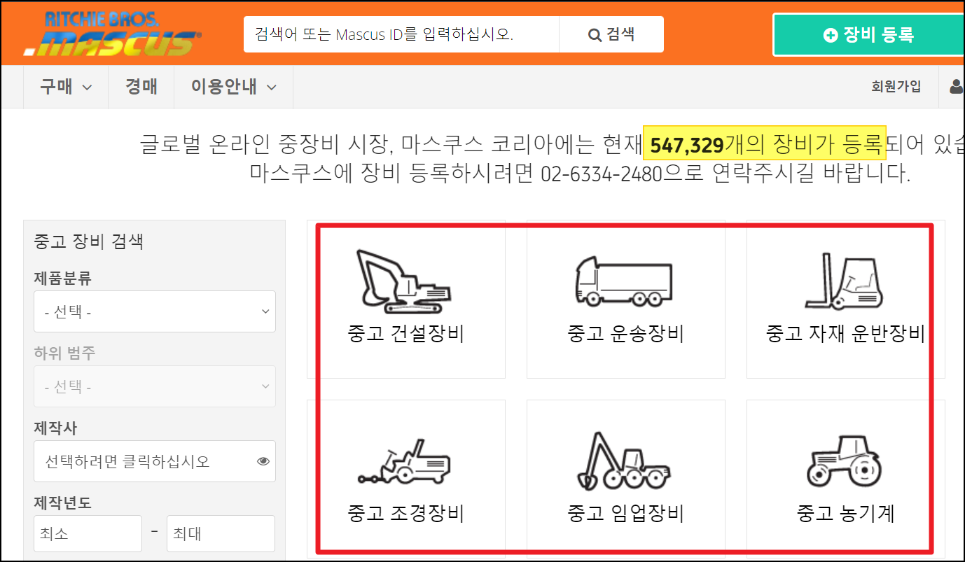 세 번째는 마스쿠스코리아인데요. 이곳에서도 중고 건설장비, 운송장비, 자재 운반장비, 농기계, 임업장비, 조경장비를 구할 수 있어요. 현재 547,329개의 장비가 등록이 되어 있다고 하니 원하는 중장비를 이곳에서 찾을 수 있을 거에요.
