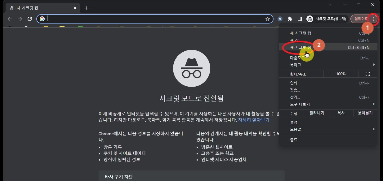 일단 사이트 이용 전에 해야 할 일이 있습니다. 바로 "시크릿 모드 사용" 인데요. 크롬 브라우저에서 우측 상단에 있는 메뉴 버튼을 누르면 3번째 위치에 해당 기능을 실행하는 버튼을 찾을 수 있습니다. "Ctrl + Shift + N" 단축키 사용을 통해서도 브라우저를 시크릿 모드로 전환 시킬 수 있는데요. 항공권이나 호텔 비교 사이트에 접속할 때 시크릿 모드를 이용하면 예약 요금을 조금 더 절약할 수 있습니다.