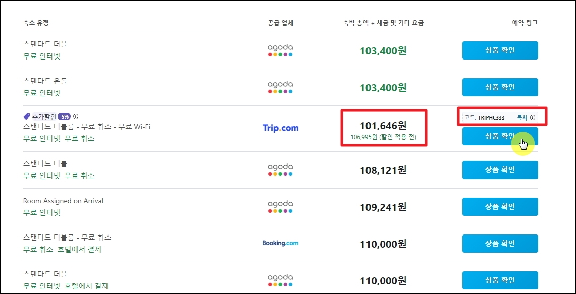 여러 호텔 예약 사이트의 가격을 모두 비교할 수 있는 페이지가 열렸습니다. 혜택과 주로 이용하는 사이트, 가격을 가지고 비교한 후 최고의 선택을 해보세요. 할인 코드를 적용하면 더 저렴하게 이용할 수 있는 곳도 일부 있는데요. 이러한 코드 사용을 통해 특가에서 추가 할인까지 더블 할인을 받을 수 있습니다.