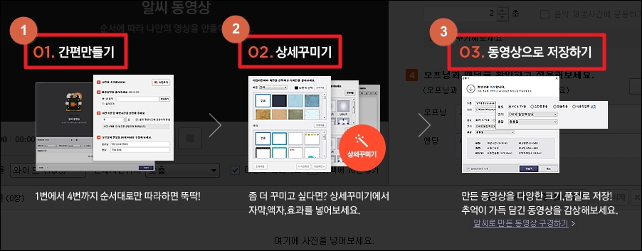 크게 3가지 단계로 동영상을 만들 수 있는데요. 1단계는 사진을 추가하여 기본적인 틀을 만드는 "간편 만들기"이고, 2단계는 자막, 액자, 효과를 추가하는 "상세 꾸미기", 3단계는 비디오 플레이어를 이용하여 재생할 수 있도록 동영상 파일로 저장하는 것입니다. 그럼 프로그램 다운부터 동영상 저장까지 설명해 드리겠습니다.