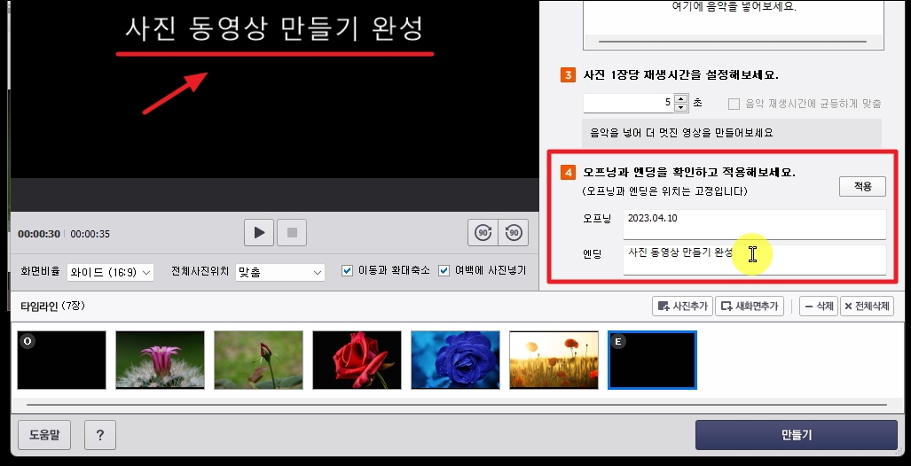 마지막으로 오프닝과 앤딩 문구를 입력할 수 이쏟록 되어 있는데요. 저는 오프닝에는 금일 날짜를 입력하고, 앤딩에는 "사진 동영상 만들기 완성" 문구가 나타나도록 했습니다.