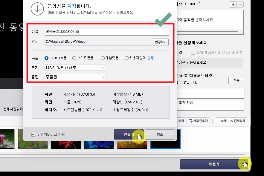 1단계에서 4단계 까지 작업 진행을 완료했다면 프로그램 우측 하단예 있는 [만들기] 버튼을 클릭해 주세요. 그럼 새로운 창이 하나 나타나는데요. 이름, 위치, 용도, 크기, 품질을 마음대로 지정한 후 [만들기] 버튼을 눌러줍니다.