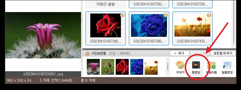 방금 사진 보관함에 5개의 이미지 자료를 추가하였습니다. 이 상태에서 프로그램 우측 하단에 있는 [동영상] 버튼을 클릭합니다.