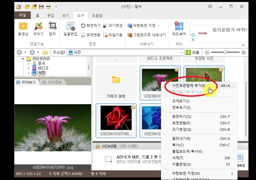 알씨를 실행하면 동영상 제작에 앞서 여기에 구성요소로 사용할 이미지 파일을 준비해야 합니다. 준비된 사진을 가지고 프로그램 상에서 선택한 후 보관함에 추가해 주세요.