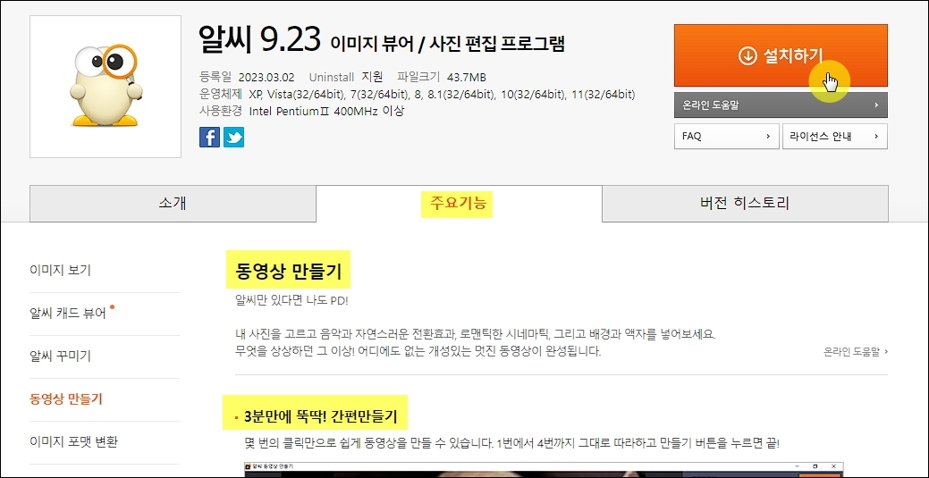 동영상 제작 프로그램을 사용하려고 하는데, 이미지 뷰어 프로그램인 "알씨"를 설치하는 것에 대해서 이상하게 생각하는 분들이 계실텐데요. 알씨에는 사진 파일을 가지고 영상 파일을 만드는 기능을 갖추고 있답니다. 음악 넣기, 자연스러운 전환 효과 넣기, 로멘틱한 시네마틱 적용, 배경과 액자 추가 등 다양한 작업을 할 수 있죠. 그럼 알툴즈 사이트에서 [설치하기] 버튼을 눌른 후 컴퓨터에 설치해 주세요.