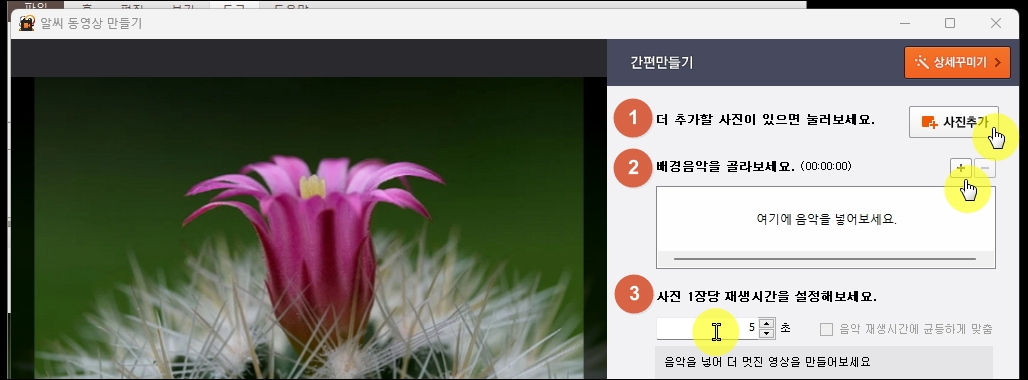 알씨에서 "간편 만들기" 창이 열렸습니다. 1단계는 사진을 추가하는 기능이고요. 2단계는 배경음악을 추가할 수 있습니다. 3단계는 각 사진이 해당 작품에서 얼마의 시간 동안 나타나도록 할 것인지 정할 수 있어요. 다음 화면에 보면 우측 상단에 "상세 꾸미기" 버튼이 있는데요. 해당 버튼을 누르면 자막, 액자, 효과를 추가할 수 있습니다.