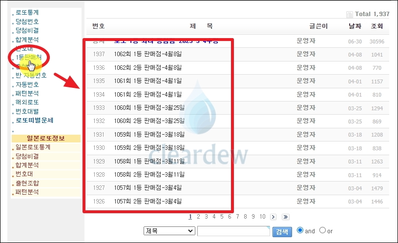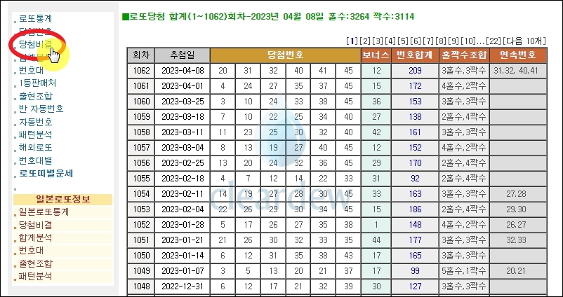 새롭게 열린 로또 게시판 페이지를 보면 좌측에 관련 메뉴가 여러 개 나타나는 것을 확인할 수 있습니다. 여기에서 3번째 위치한 "당첨비결"을 선택해 보세요. 그럼 1회에서 현재까지 추첨된 로또 당첨 번호를 확인할 수 있습니다. 번호 합계, 홀짝수 조합, 연속번호 정보도 추가로 확인할 수 있어서 좋아요.