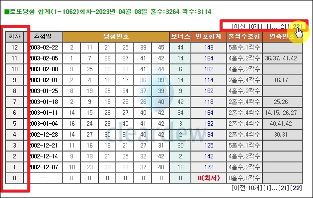 ▼ 새롭게 열린 로또 게시판 페이지를 보면 좌측에 관련 메뉴가 여러 개 나타나는 것을 확인할 수 있습니다. 여기에서 3번째 위치한 "당첨비결"을 선택해 보세요. 그럼 1회에서 현재까지 추첨된 로또 당첨 번호를 확인할 수 있습니다. 번호 합계, 홀짝수 조합, 연속번호 정보도 추가로 확인할 수 있어서 좋아요.