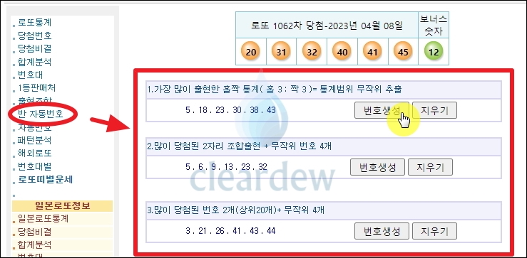 앞서 확인한 통계 자료를 손쉽게 활용할 수 있습니다. 바로 고베스트에서 제공하는 로또 번호 생성기를 사용하면 되는데요. 좌측에 있는 메뉴에서 [반 자동번호]를 선택해 보세요. 그럼 가장 많이 출현한 홀짝, 숫자, 조합 등을 가지고 만든 로또 추천 프로그램을 무상으로 사용할 수 있어요.