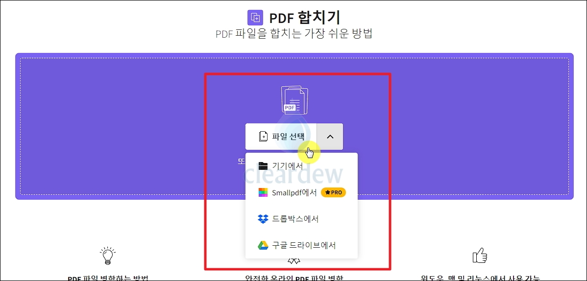 여기까지 진행했으면 거의 작업을 완료한 것과 다름 없습니다. 화면 중앙에 있는 [파일 선택] 버튼을 클릭한 후 기기, 드롭박스, 구글 드라이브에 있는 PDF 파일을 선택해 주세요. 해당 작업을 진행하기 위해서는 2개 이상의 파일을 선택해야 합니다.