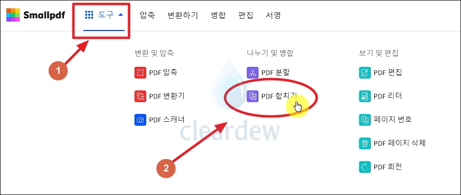 이번 시간에 우리는 위 메뉴 중에서 "나누기 및 병합" 카테고리에 있는 [PDF 합치기] 메뉴를 이용할 겁니다.
