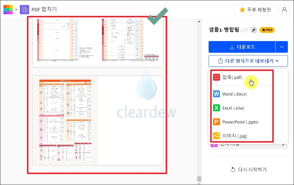 새롭게 바뀐 페이지에서 좌측에 위치한 미리보기 화면을 통해 병합 작업에 대한 결과를 확인할 수 있습니다. 다운로드 버튼을 눌러서 병합된 결과물을 파일로 내려 받을 수 있습니다. 압축이 된 PDF, 워드, 엑셀, 파워포인트, 이미지 형식으로 내려 받는 것도 가능합니다.