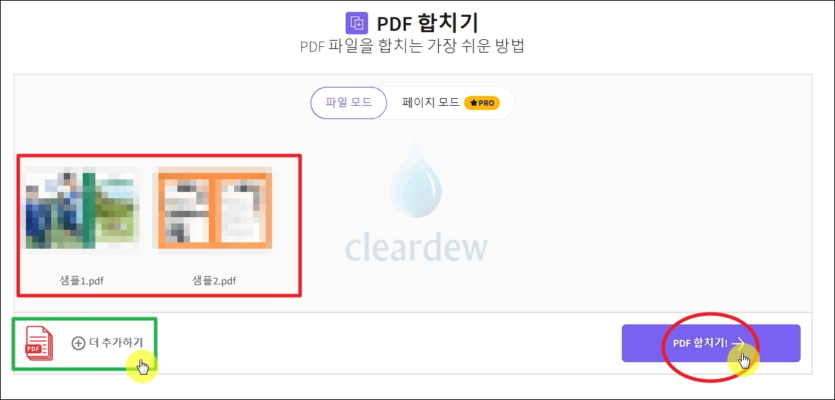 저는 샘플로 사용하려고 만든 PDF 파일 2개를 준비했습니다. 2개를 추가한 상태에서 추가로 합치고 싶은 파일이 생겼다면 [더 추가하기] 버튼을 눌러서 PDF를 하나 더 추가해 주세요. 그럼 화면 중앙에 선택한 썸네일 화면이 나타났다면 [PDF 합치기] 버튼을 눌러줍니다.