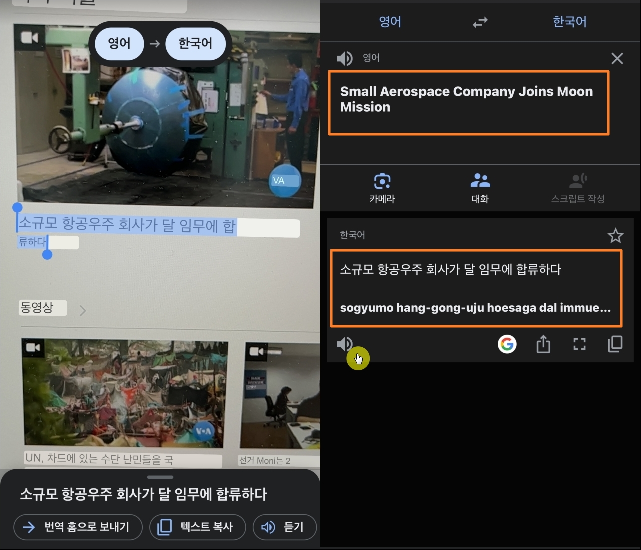 추가적으로 스마트폰 카메라로 비춘 원문에 대하여 번역된 문장의 발음을 들어 보는 것이 가능하고요. 내용을 복사하여 다른 곳으로 옮기는 것도 쉽게 할 수 있습니다.