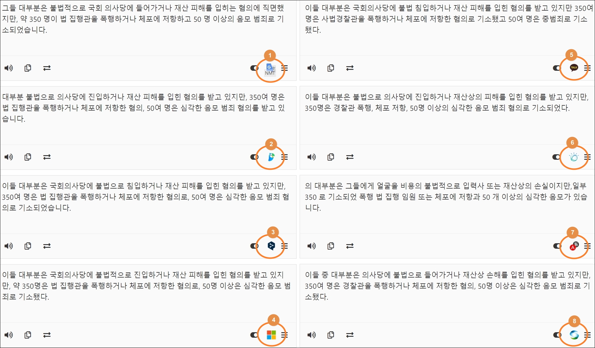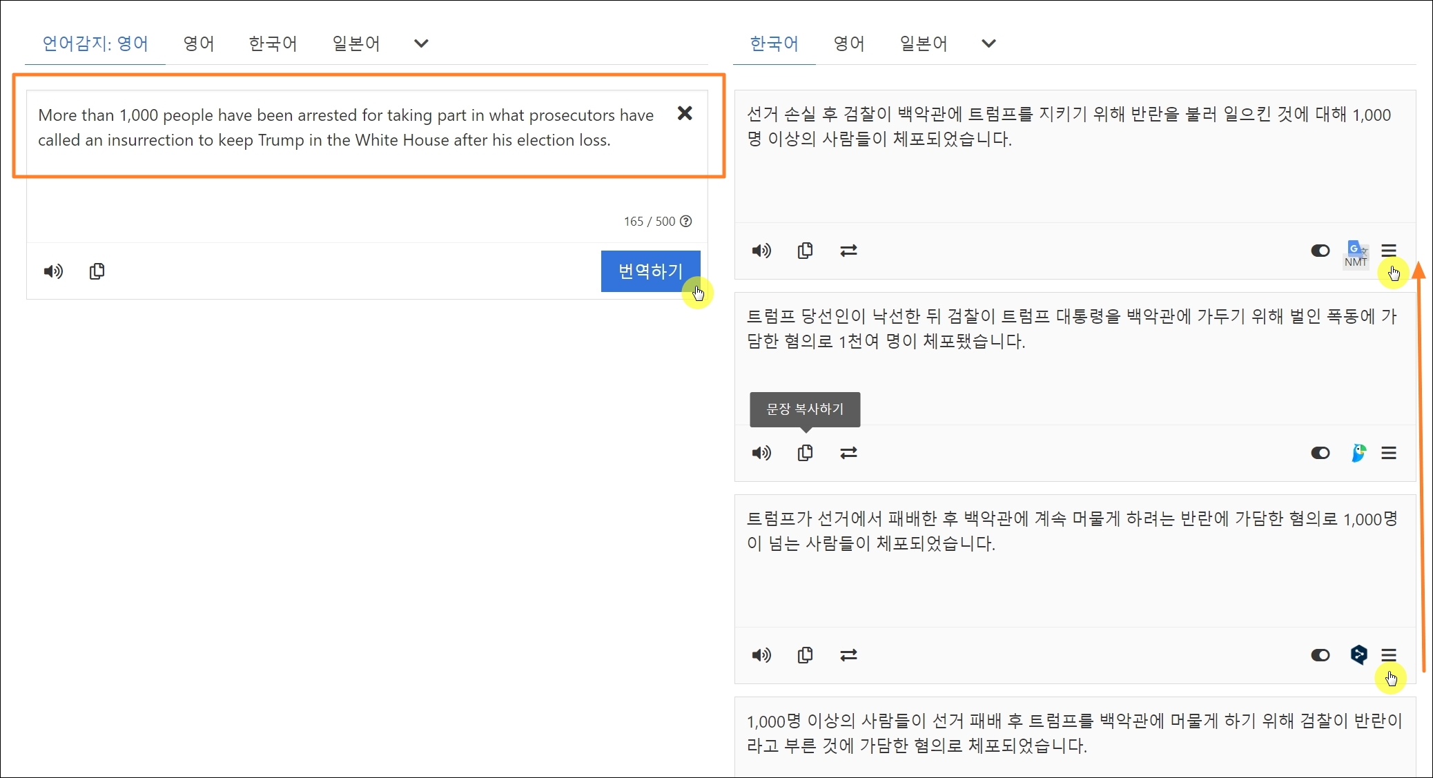 사용법은 간단합니다. 좌측 상단에 있는 영역에 원문 내용을 입력합니다. 그 다음 번역하기 버튼을 클릭해 주세요. 그럼 오른편에 여러 서비스의 번역 결과가 나타나는데요.