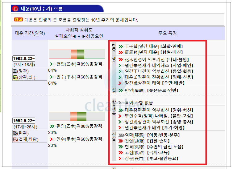 10. 만세력에서 가장 핵심이 되는 것은 대문이라고 생각합니다. 10년 주기로 나의 인생의 큰 흐름을 결정짓는 것인데요. 사주 풀이 도우미 사이트에서 10년마다 어떻게 들어오는지 해석을 통해 알 수 있어요.