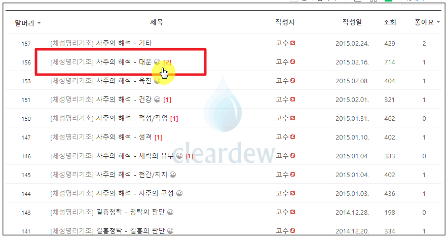 3. 사주 기초 게시판에 보면 만세력 보는 방법에 대한 게시글이 있습니다. 조회수가 상당한 만큼 많은 사람들이 이용한 내용이죠. 해당 게시글을 읽고, 화면 상단에 있는 체성명리기초를 클릭해 보세요.