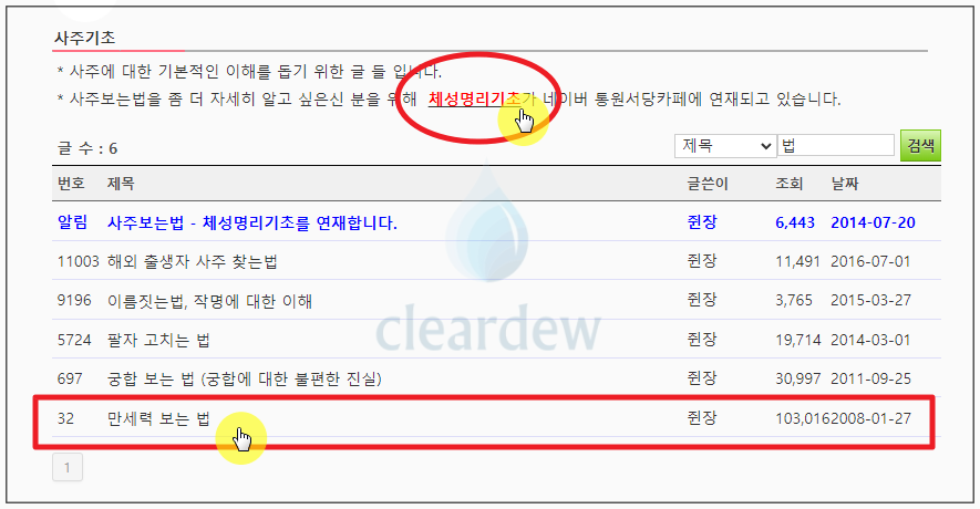3. 사주 기초 게시판에 보면 만세력 보는 방법에 대한 게시글이 있습니다. 조회수가 상당한 만큼 많은 사람들이 이용한 내용이죠. 해당 게시글을 읽고, 화면 상단에 있는 체성명리기초를 클릭해 보세요.
